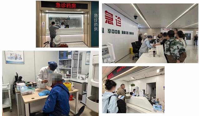 在回龙观院区急诊大厅,分诊台、收费窗口、急诊药房、急诊放射……医护人员在有条不紊地忙碌着。