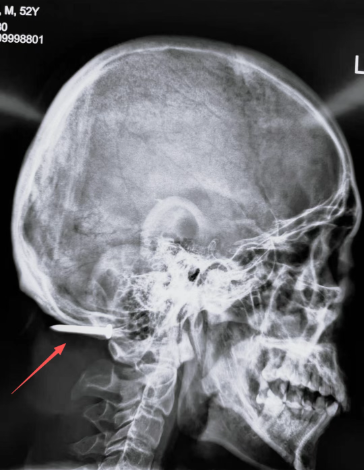 经急诊医师问诊得知,患者是一名工人,作业时不慎被射钉枪击中。射钉枪常用于钢筋混凝土施工,枪口动能巨大,导致钢钉从其左侧下颌射入,先后穿透下颌骨、口腔、颈椎间隙,最终深嵌枕部颅骨下方。伤后患者随即出现呕血症状,虽辗转多家医院,却因病情复杂、手术风险极高,最终被转至北京积水潭医院。