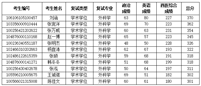 北京市创伤骨科研究所2026年硕士研究生招生调剂复试工作,经北京市创伤骨科研究所研究生招生工作领导小组批准核实后,根据考生总分在所报专业和研究方向进行排名(若总分相同,按照英语、政治、西医综合的顺序依次比较单科成绩),按照招生人数1:3的比例(人数不足者按照实际合格人数)确定了进入调剂复试的考生名单,具体名单如下: