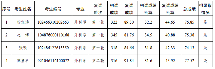 根据教育部及北京市招生考试委员会相关文件精神,北京市创伤骨科研究所按照《2026年硕士研究生复试调剂工作办法》开展了2026年硕士研究生招生考试复试录取工作,现将拟录取名单公示如下: